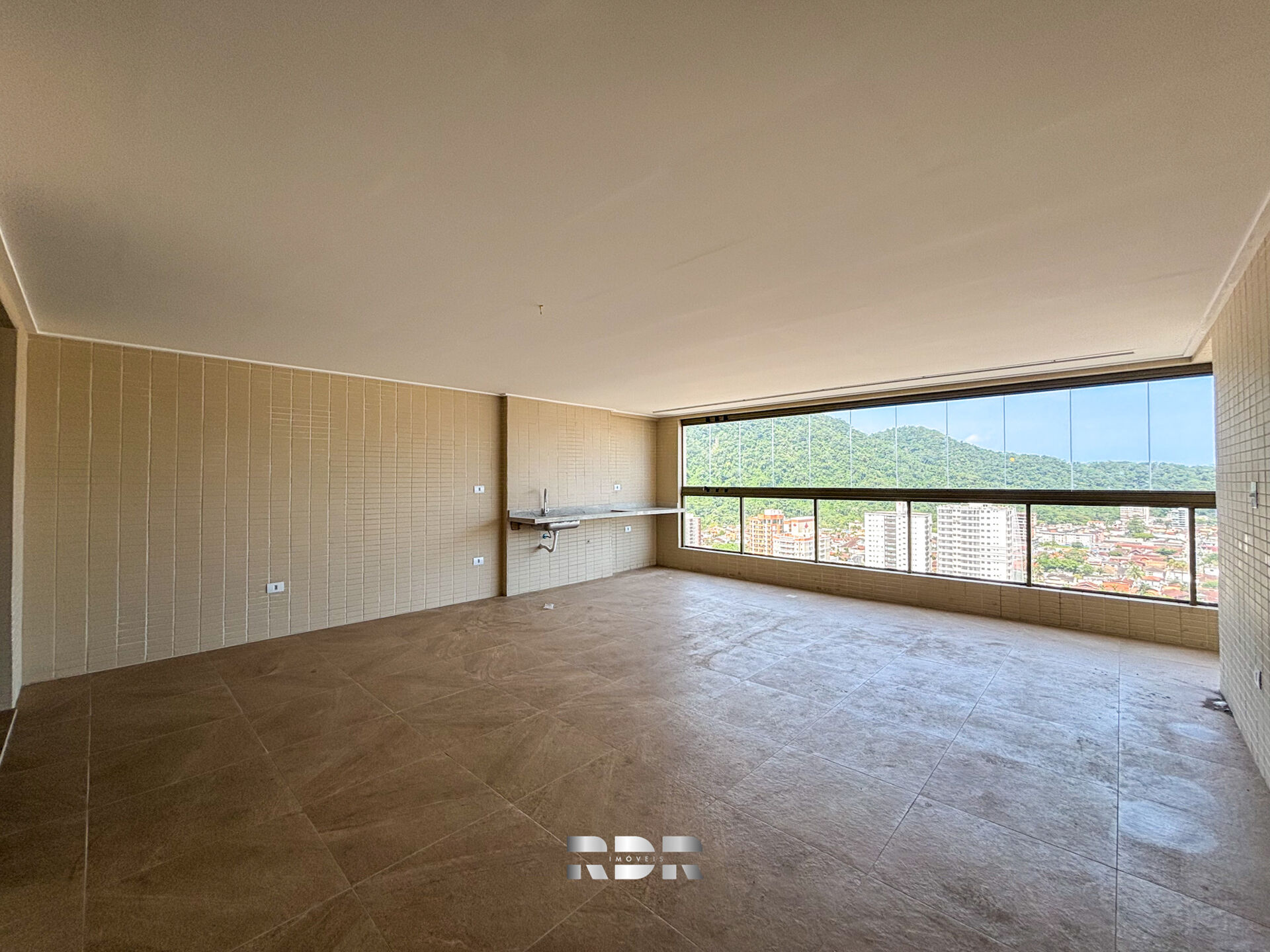 •Varanda gourmet gigantesca com vista para a Avenida Mallet, para o mar e para o Morro Xixová